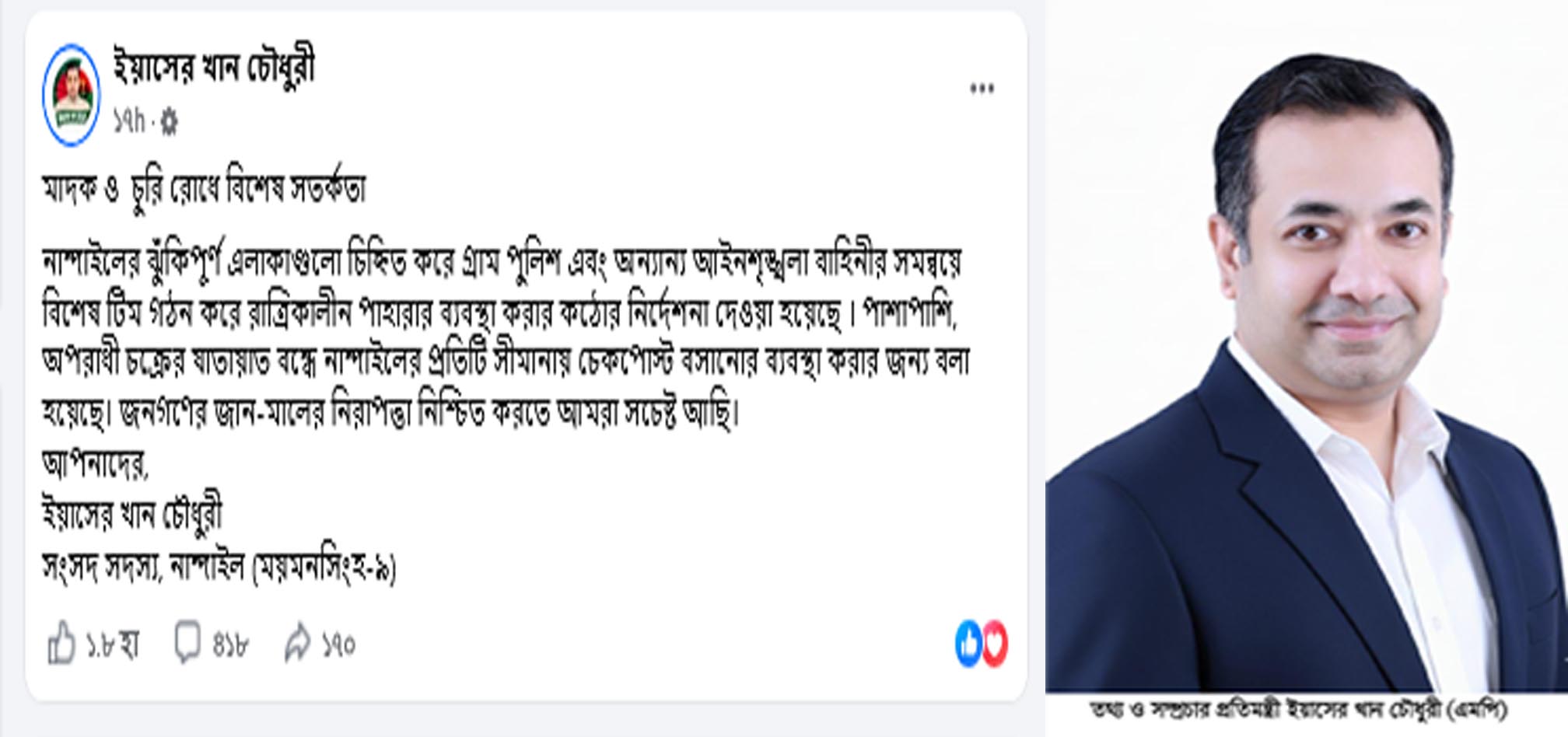 এ বিষয়ে নান্দাইল আসনের সংসদ সদস্য ও তথ্য প্রতিমন্ত্রী ইয়াসের খান চৌধুরী এক বিবৃতিতে বলেন, “নান্দাইলের জনগণের নিরাপত্তা আমাদের সর্বোচ্চ অগ্রাধিকার। মাদক ও চুরির মতো সামাজিক ব্যাধি নির্মূলে আমরা জিরো টলারেন্স নীতি গ্রহণ করেছি। আইনশৃঙ্খলা বাহিনীর পাশাপাশি গ্রাম পুলিশকেও সক্রিয় করা হয়েছে। আমরা সচেষ্ট আছি যেন সাধারণ মানুষ নির্ভয়ে ও শান্তিতে বসবাস করতে পারে।”