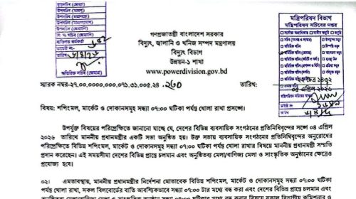 নিজস্ব প্রতিবেদক: দেশের বর্তমান বিদ্যুৎ পরিস্থিতি বিবেচনায় বিদ্যুৎ সাশ্রয়ের লক্ষ্যে সকল শপিংমল, মার্কেট ও দোকানপাট প্রতিদিন সন্ধ্যা ৭টার মধ্যে বন্ধ করার নির্দেশ দিয়েছে সরকার। একইসঙ্গে সকল বিলবোর্ড বা বিজ্ঞাপনী আলোকসজ্জাও…